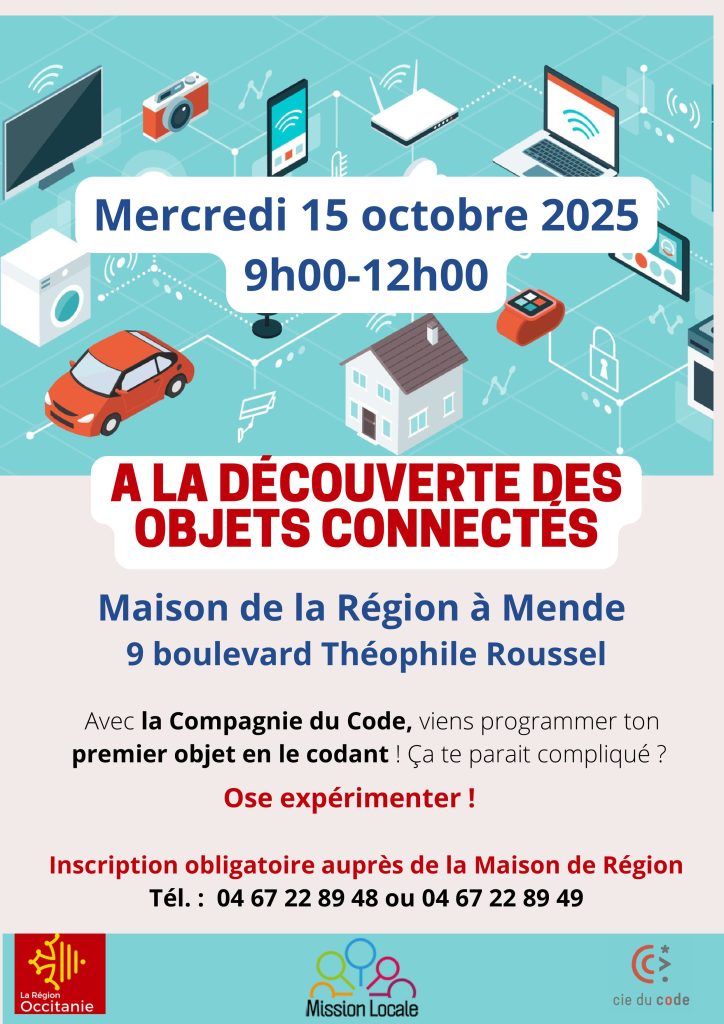 Les métiers du code vous intéressent ? Alors venez découvrir les objets connectés le mercredi 15 octobre 2025 de 9h à 12h dans les locaux de la Maison de la Région, 9 Bd Théophile Roussel à Mende.