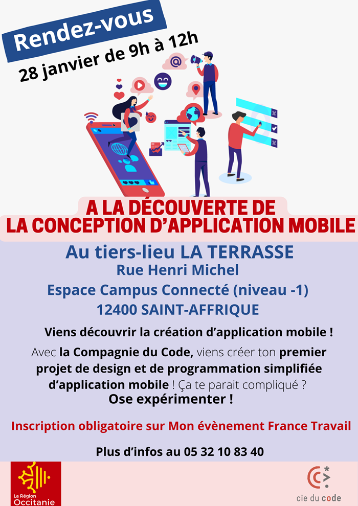 Les métiers de la programmation et des applications mobiles vous intéressent ? Alors venez découvrir cet univers le mercredi 28 janvier 2026 de 9h à 12h au Tiers-lieu La Terrasse, rue Henri Michel, Espace Campus Connecté (niveau -1) à Saint-Affrique.